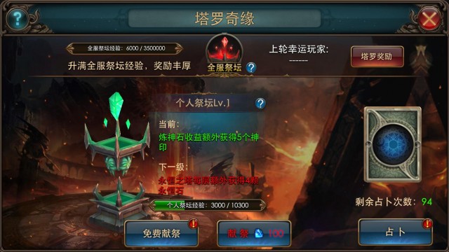 如果守护者要想提升祭坛的等级,那就得提到献祭了!献祭是祭坛获取经验的唯一途径,目前献祭分别为三种类型:免费献祭、钻石献祭、占卜献祭,不同的献祭手段其提升的功效也不一样。而在守护者提升个人祭坛的同时全服祭坛也会随之增长经验,当全服祭坛的火焰升至顶峰之时,塔罗之神会勉励大家的虔诚与奉献,随机赐予玩家奖励。