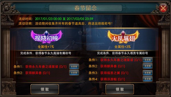 春节期间集齐对应道具,可赢得春节专属称号。2017鸡年特供, 错过不再有。