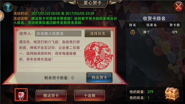 走心的新年贺卡活动登场。说出深藏很久的话!把你的新春祝福送给他!春节期间收到贺卡与送出贺卡的玩家都会得到一份惊喜的新年礼物!